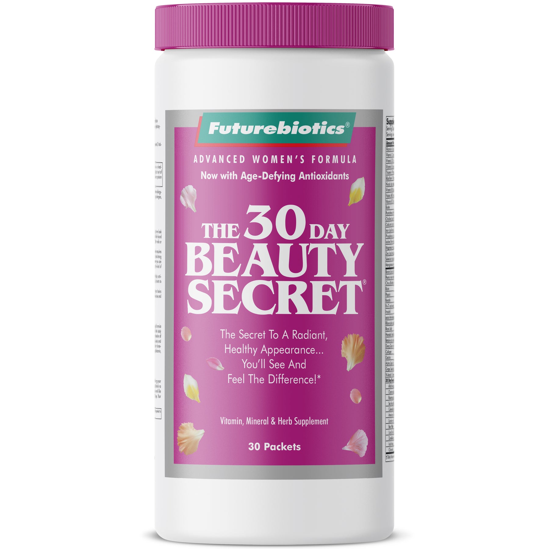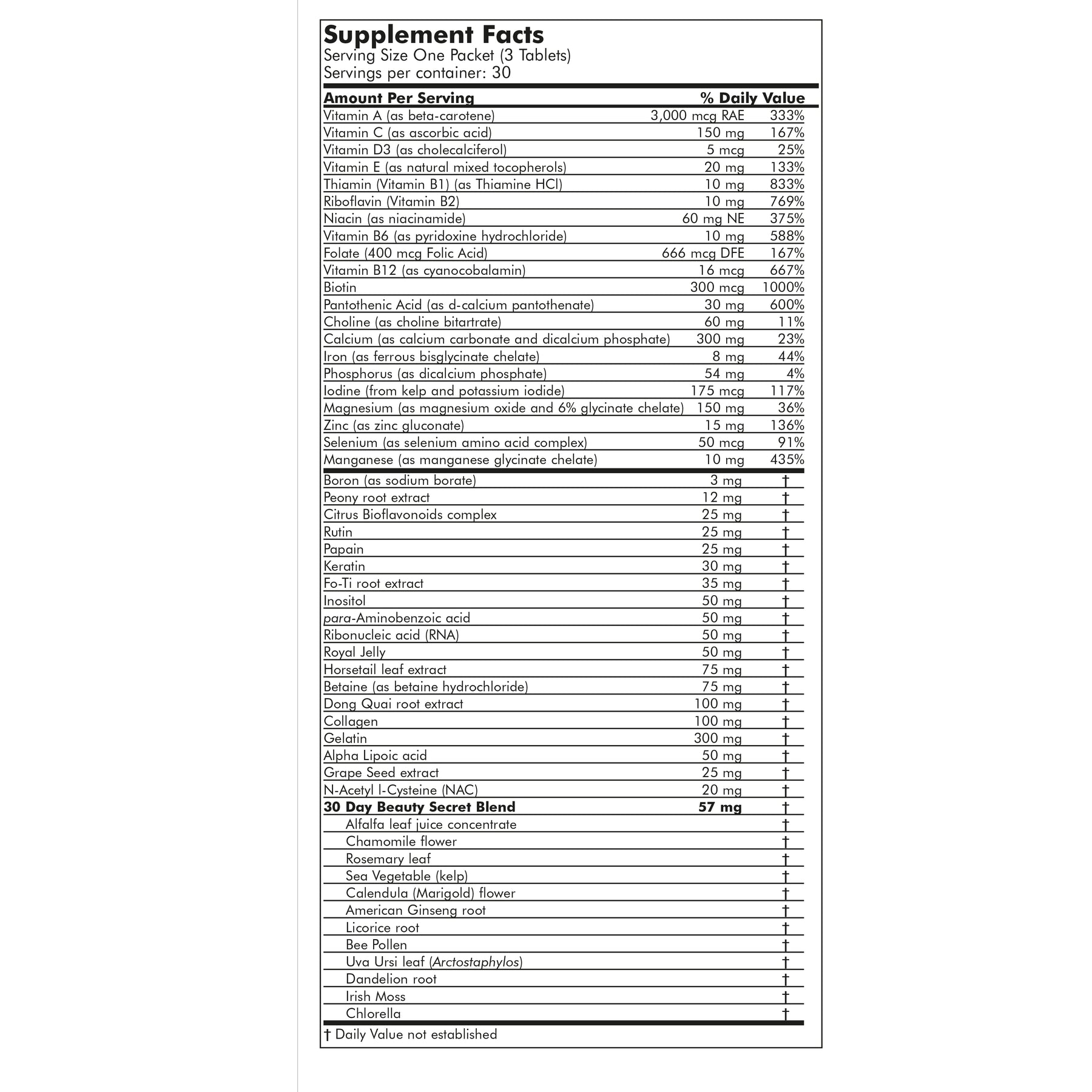 Healthy hair, skin and nails provide women with an indescribable glow that allows them to feel their best. Daily stress, pollution, and toxins are all common factors that can negatively affect our body and cause signs of aging. The ingredients in Futurebiotics anti-aging supplement known as the 30-Day Beauty Secret have been shown to help the body fight those signs of aging with antioxidants, nutrients, and essential vitamins.* Each daily packet contains ingredients that help to support the body's ability to regenerate and protect against those harsh environmental stressors.* Along with those essential vitamins and minerals that you would see in a multivitamin, we've formulated this beauty supplement with antioxidants like Green Tea Extract, Alpha Lipoic Acid and Grape Seed extract, as well as ingredients like Keratin, Collagen, Gelatin and Calcium that help support supple skin, strong nails, and lustrous hair.* Simply take one packet (three tablets) for a fast, convenient, all-in-one anti-aging supplement.
