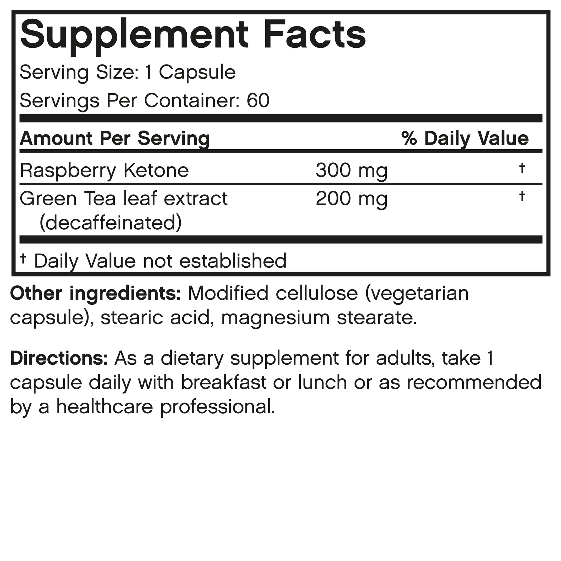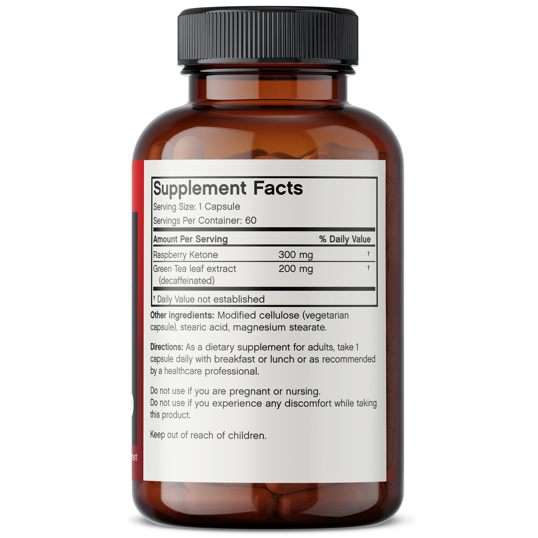 • 300mg of Raspberry Ketone and 200mg of Green Tea extract per capsule