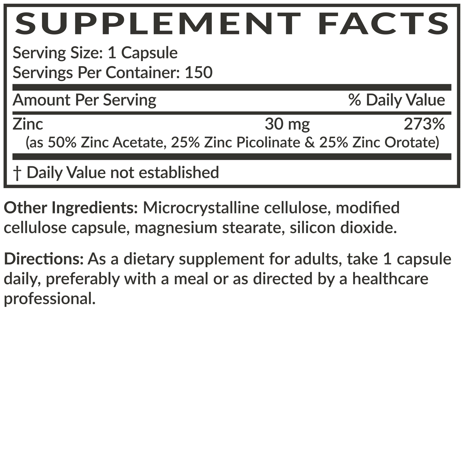 Ingredients: Zinc (as Zinc Acetate, 25% Zinc Picolinate & 25% Zinc Orotate).
