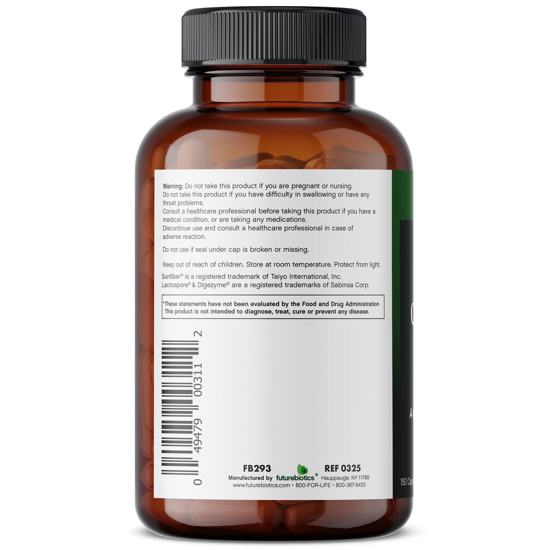 Digestive issues can cause uncomfortable symptoms such as diarrhea, gas, bloating and constipation, and poor diets have made these issues more common than ever. Fiber is a critical part of a healthy digestive system as it helps keep the digestive tract moving and colon cells use fiber as fuel. Futurebiotics Colon Green fiber supplement is a simple and healthy way to increase your fiber intake without unpleasant drinks or intensive diet changes*. Futurebiotics colon care supplement is made with Sunfiber Guar Gum, which provides your body with 1.66g of all-natural, soluble dietary fiber made from partially hydrolyzed guar gum. Once it hits your digestive system, it is able to absorb liquid and turn into a gel, adding bulk to your stool and helping to cleanse the digestive tract and bowel*. Our colon cleanse supplement combines dietary fiber with the powerful benefits of probiotics and digestive enzymes, which help keep a balanced level of healthy bacteria in the gut, providing support for all the same digestive challenges that fiber does*. The probiotics in our capsules supply approximately 293 million friendly probiotic cells per daily dose, are stable at room temperature and highly resistant to heat, gastric acids, and bile. For best results, take four capsules daily with at least 16 oz. of water, or as directed by a healthcare professional.