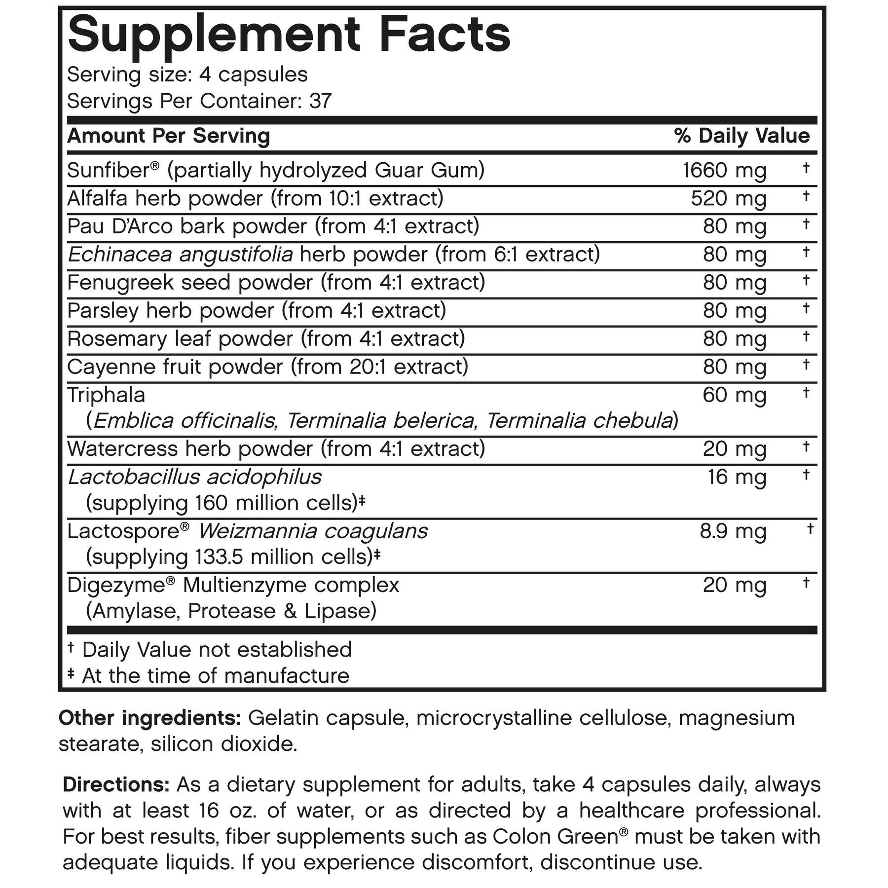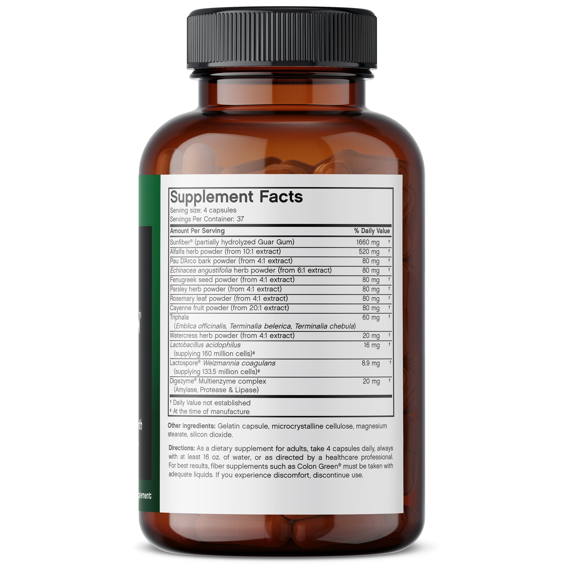 Directions: As a dietary supplement for adults, take 4 capsules daily, always with at least 16 oz. of water, or as directed by a healthcare professional. For best results, fiber supplements such as Colon Green must be taken with adequate liquids. If you experience discomfort, discontinue use.