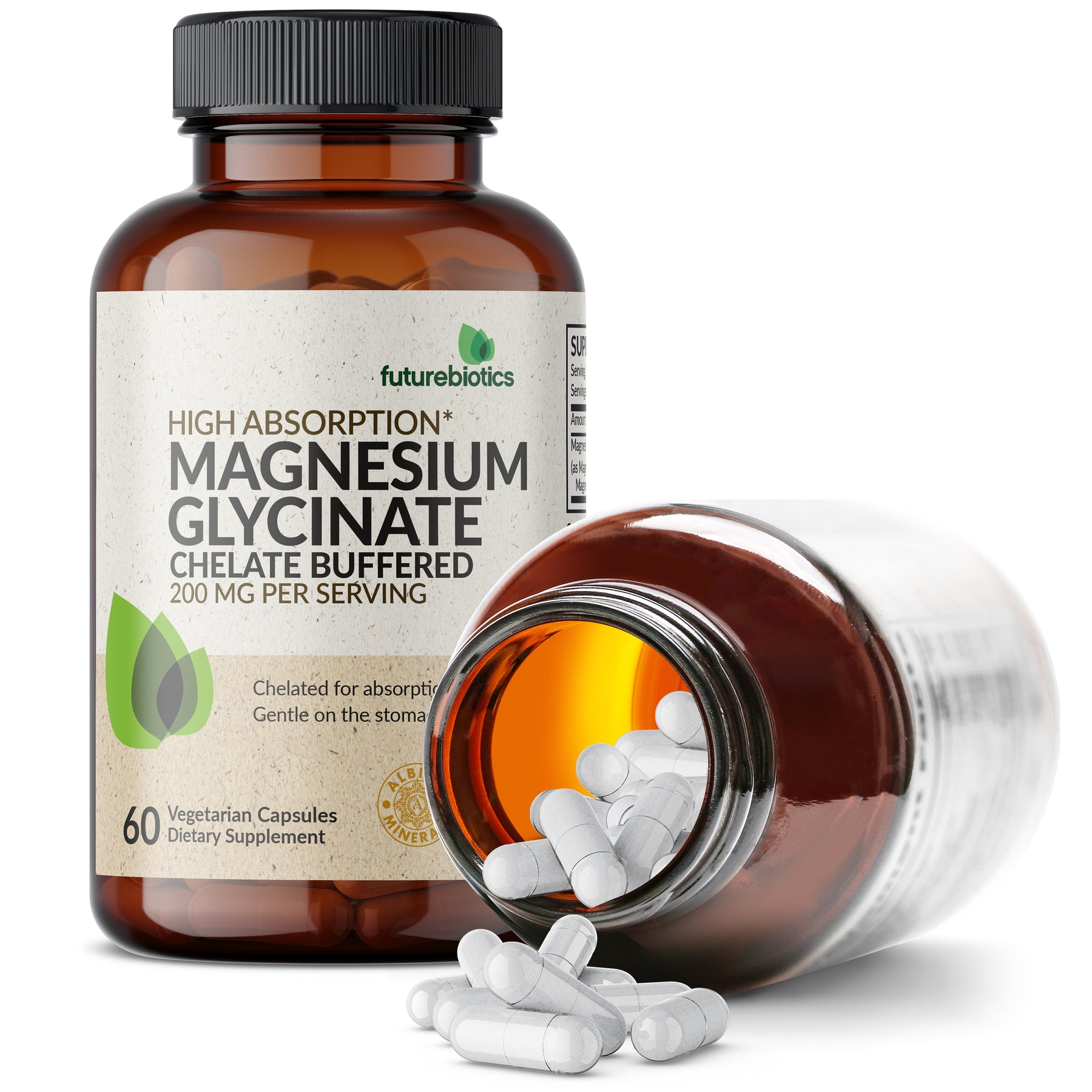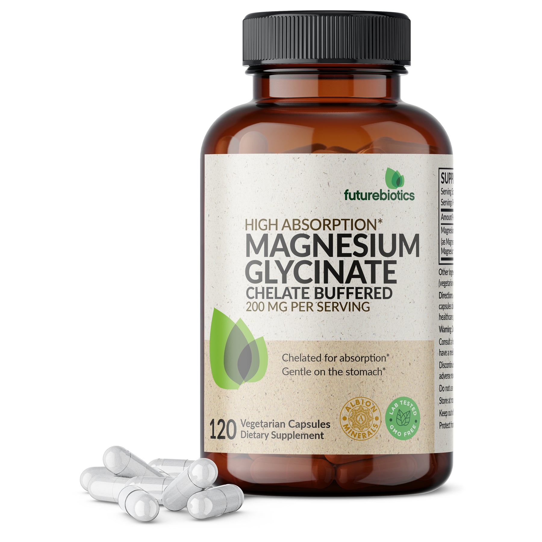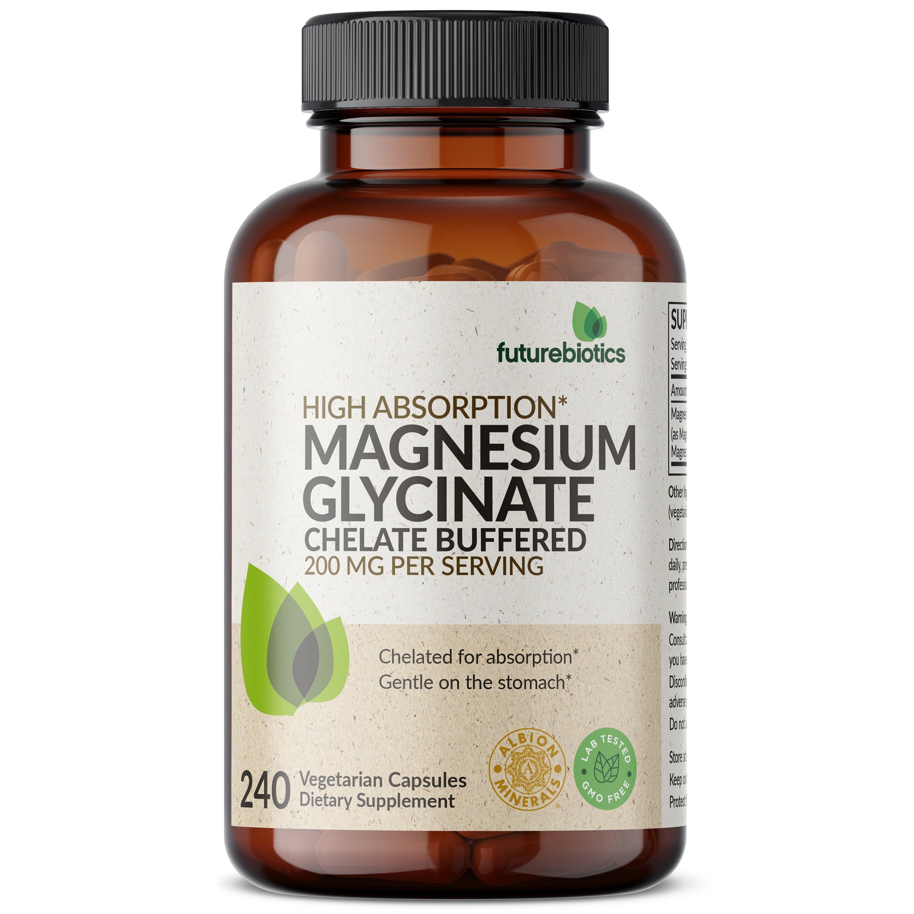 Futurebiotics Magnesium Glycinate binds minerals to amino acids to produce mineral chelates. Mineral Chelates, which are actively transported through the body and are highly absorbable, enable superior replenishment of essential nutrients. Chelated minerals are also more digestible than non chelated forms. Our High Absorption Magnesium Glycinate provides 200 MG per serving (2 Vegetarian Capsules). Laboratory tested and free of GMOs, Gluten and Soy, Magnesium Glycinate 200 MG is in-house tested and carefully manufactured by trained professionals in our state-of-the-art facility in Hauppauge, New York. Magnesium Glycinate 200 MG is Vegan/Vegetarian friendly and contains no ingredients derived from animals.