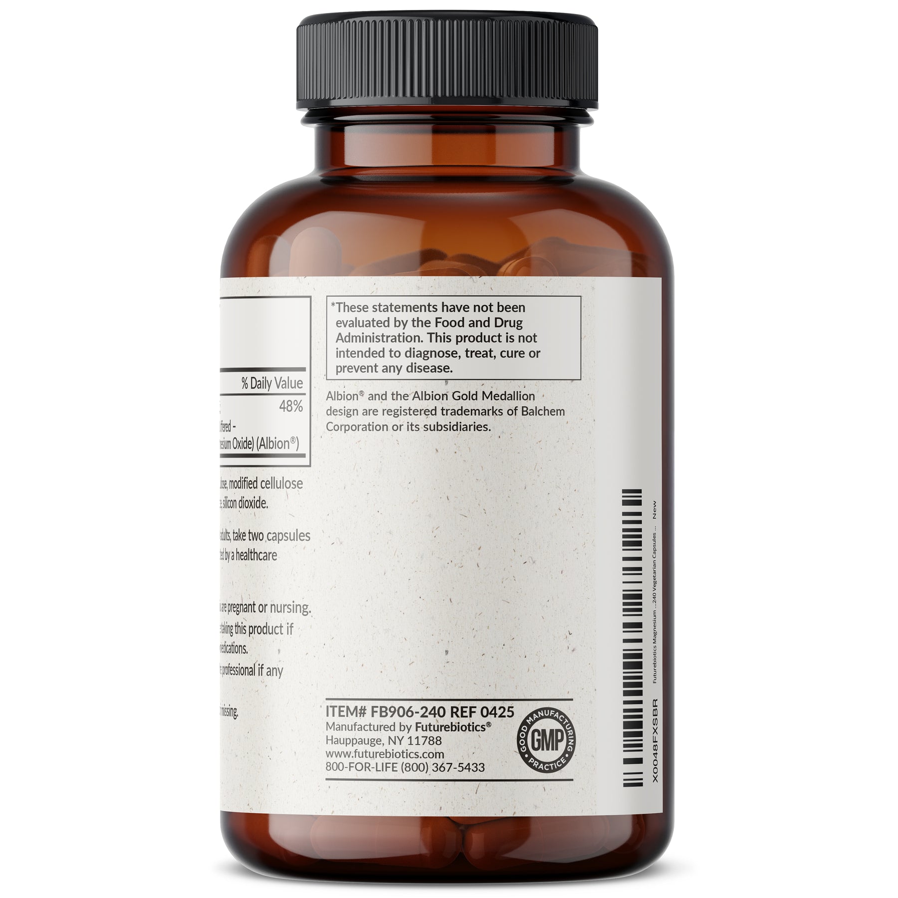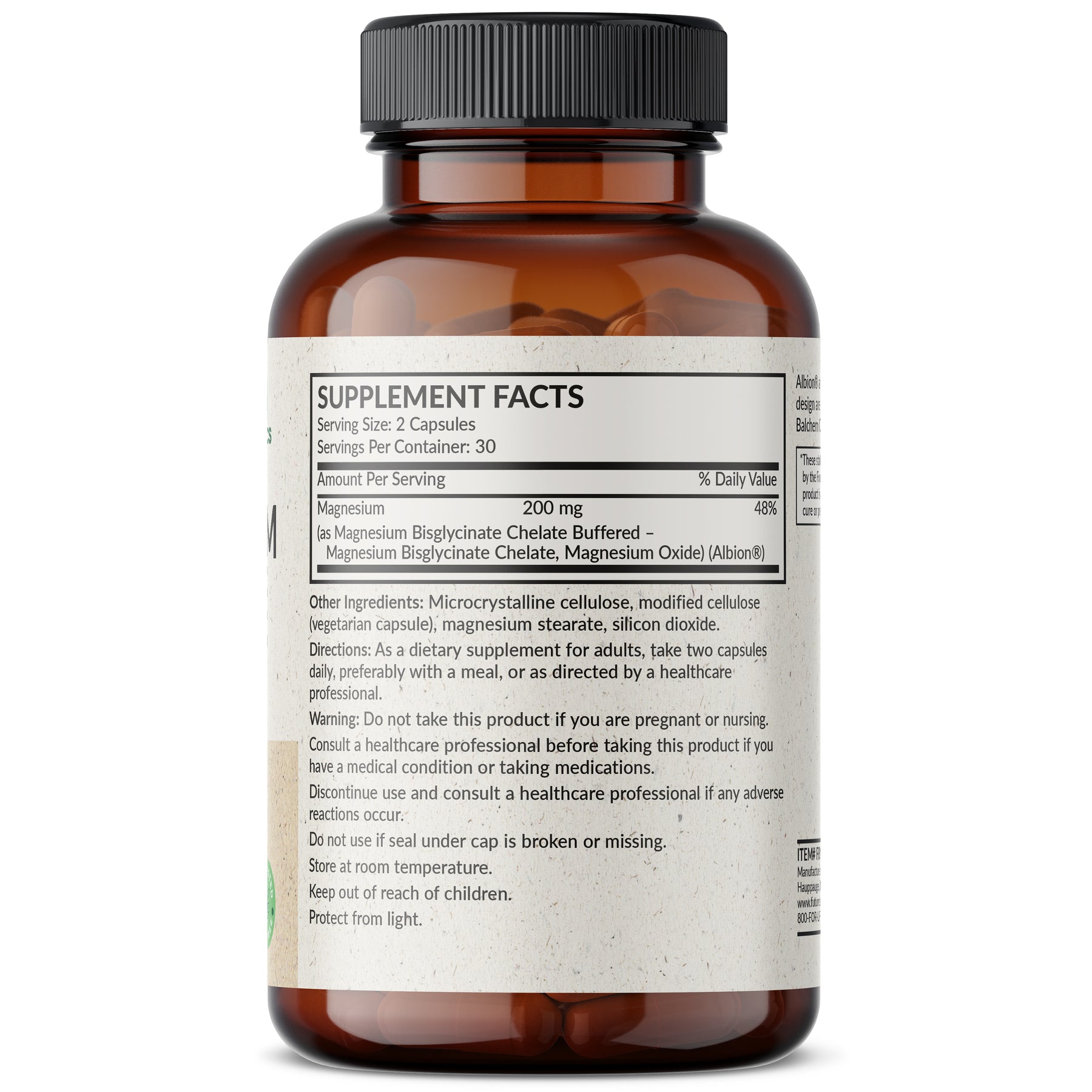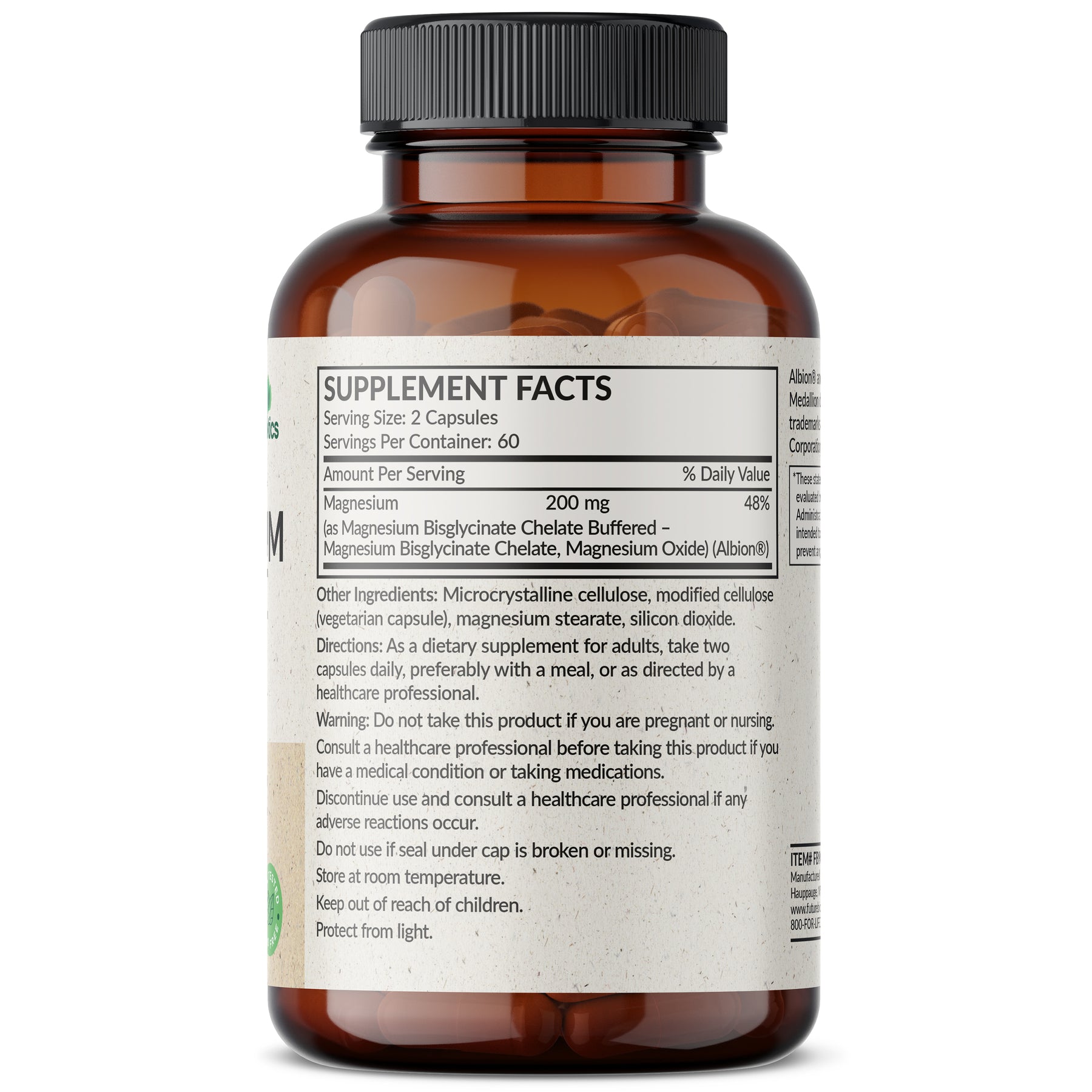 Futurebiotics Magnesium Glycinate binds minerals to amino acids to produce mineral chelates. Mineral Chelates, which are actively transported through the body and are highly absorbable, enable superior replenishment of essential nutrients. Chelated minerals are also more digestible than non chelated forms. Our High Absorption Magnesium Glycinate provides 200 MG per serving (2 Vegetarian Capsules). Laboratory tested and free of GMOs, Gluten and Soy, Magnesium Glycinate 200 MG is in-house tested and carefully manufactured by trained professionals in our state-of-the-art facility in Hauppauge, New York. Magnesium Glycinate 200 MG is Vegan/Vegetarian friendly and contains no ingredients derived from animals.