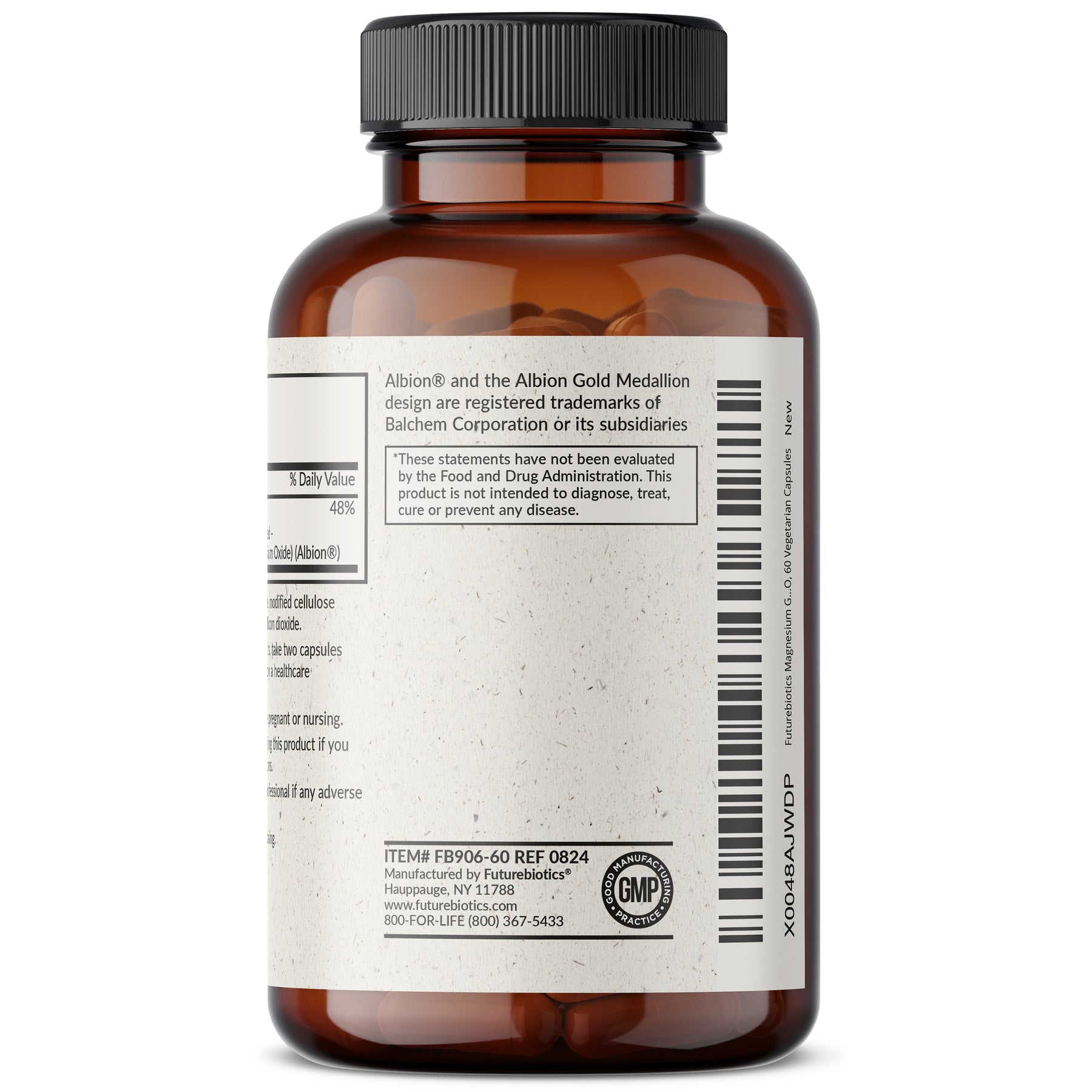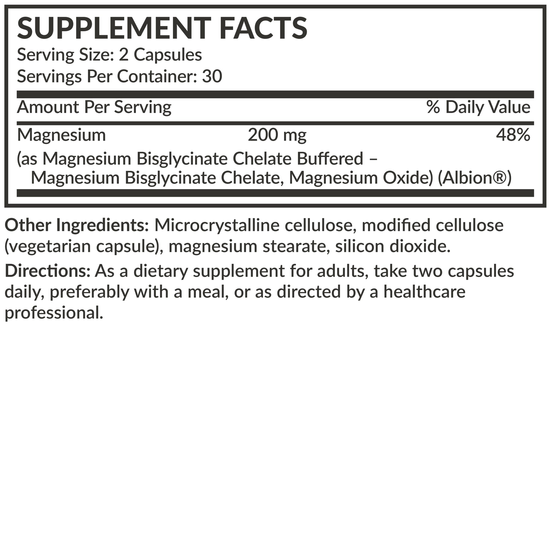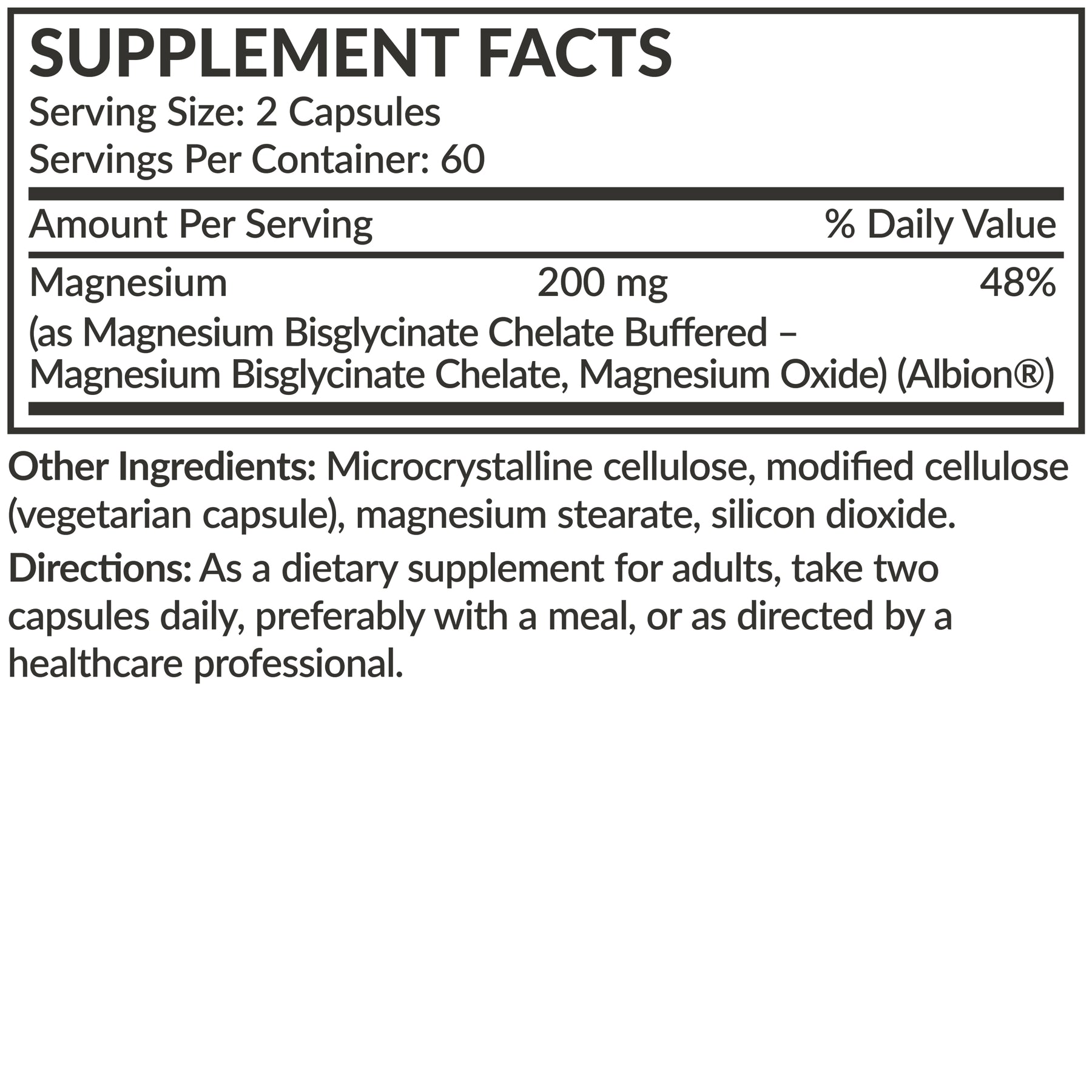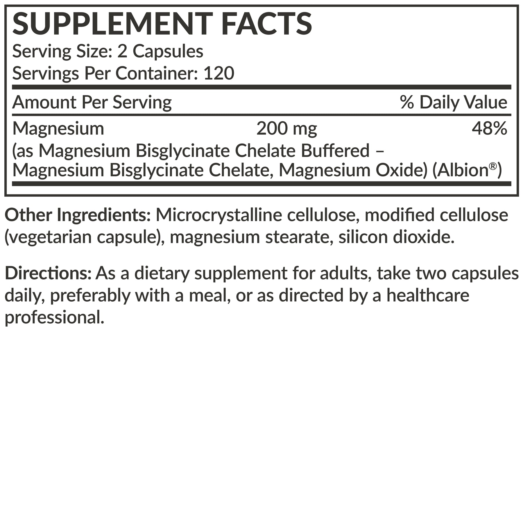 Ingredients: Magnesium (as magnesium Bisglycinate Chelate Buffered - Magnesium Bisglycinate Chelate, Magnesium Oxide) (Albion).