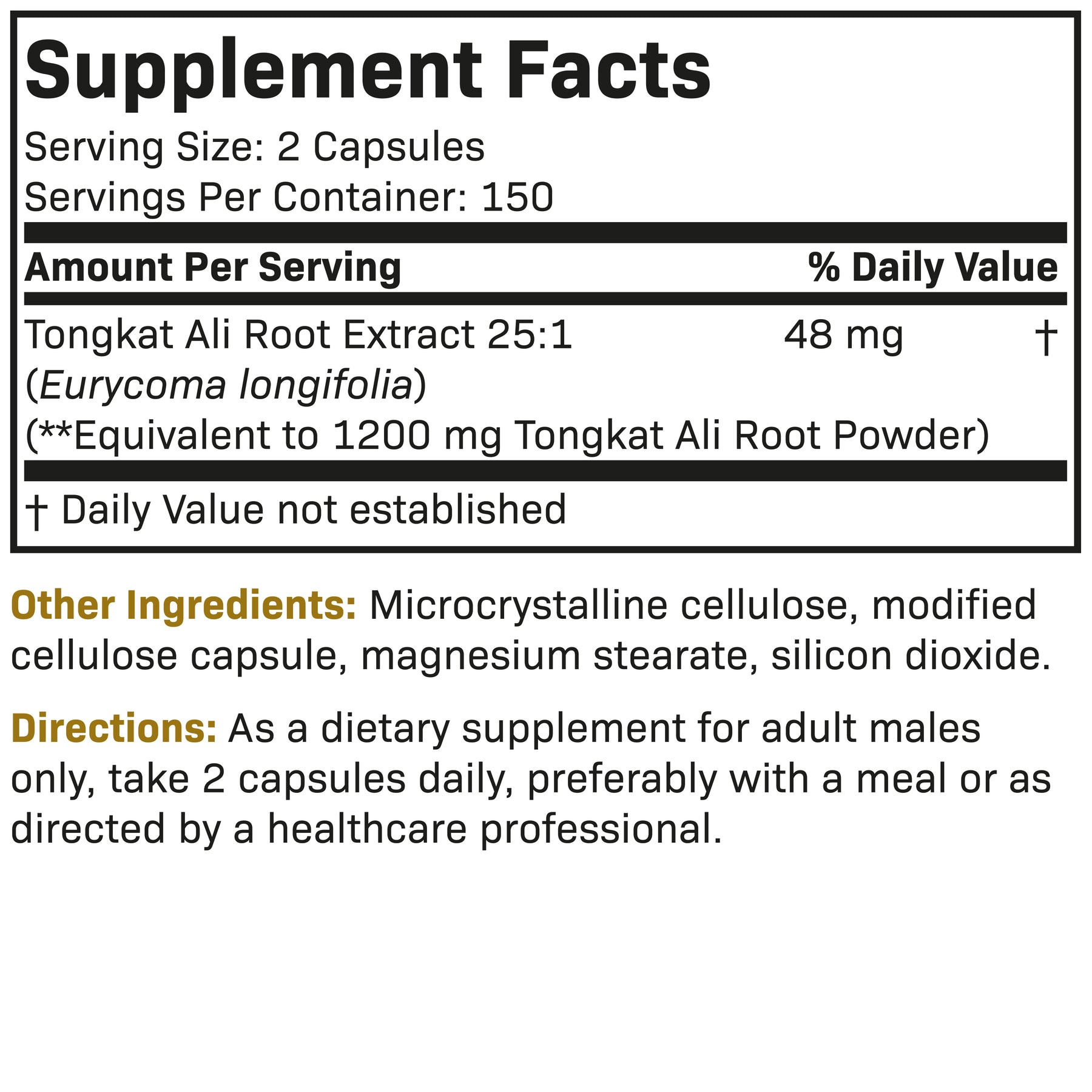 Ingredients: Tongkat Ali Root Extract (Eurycoma longifolia) (From 100:1 extract meyenii) (From 1000 mg of 4:1 extract)