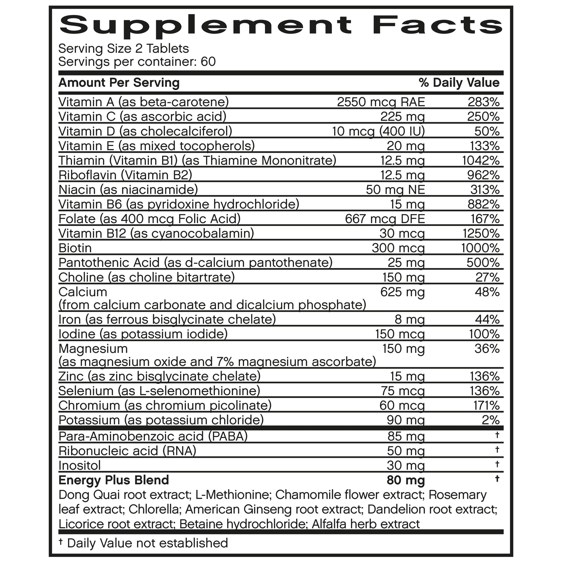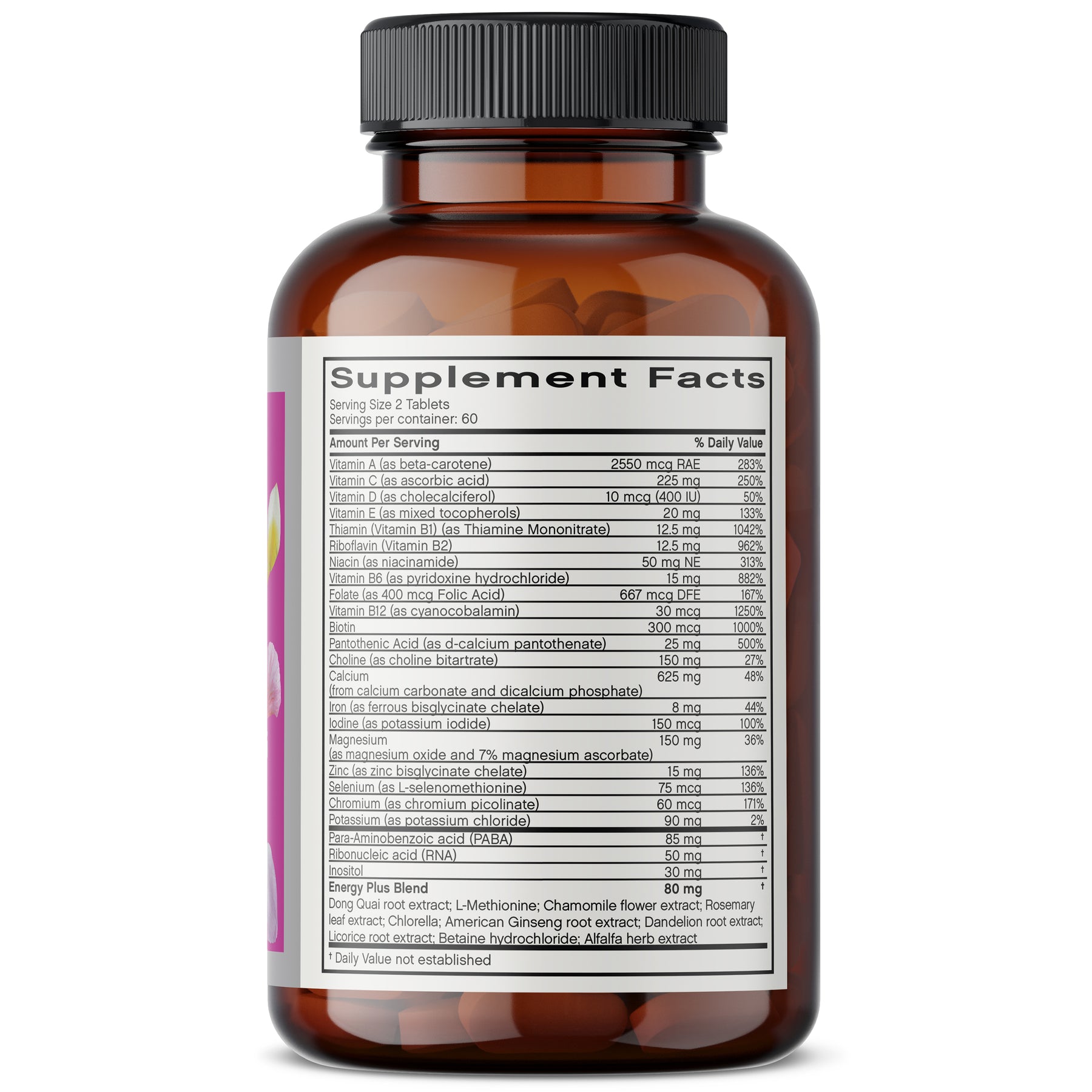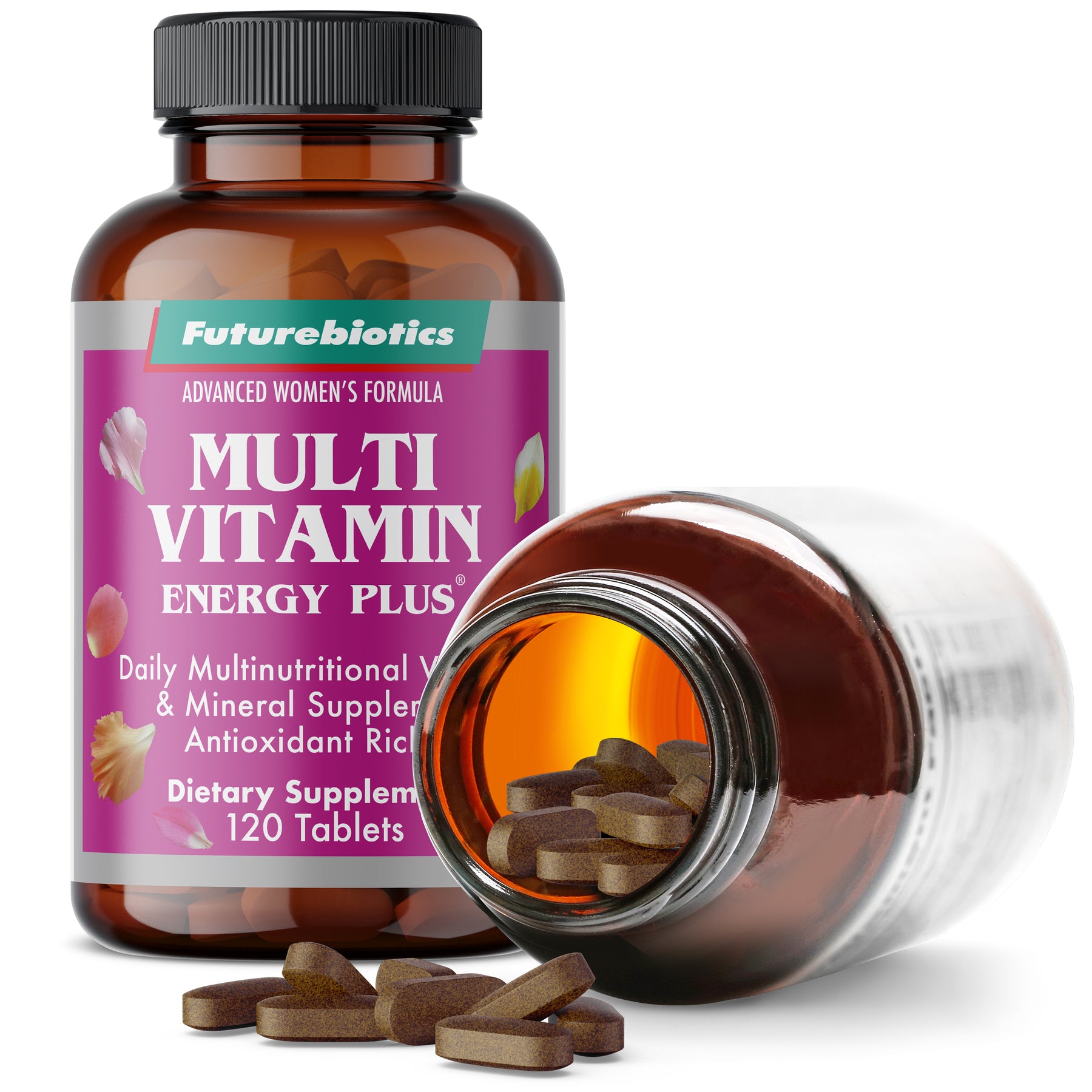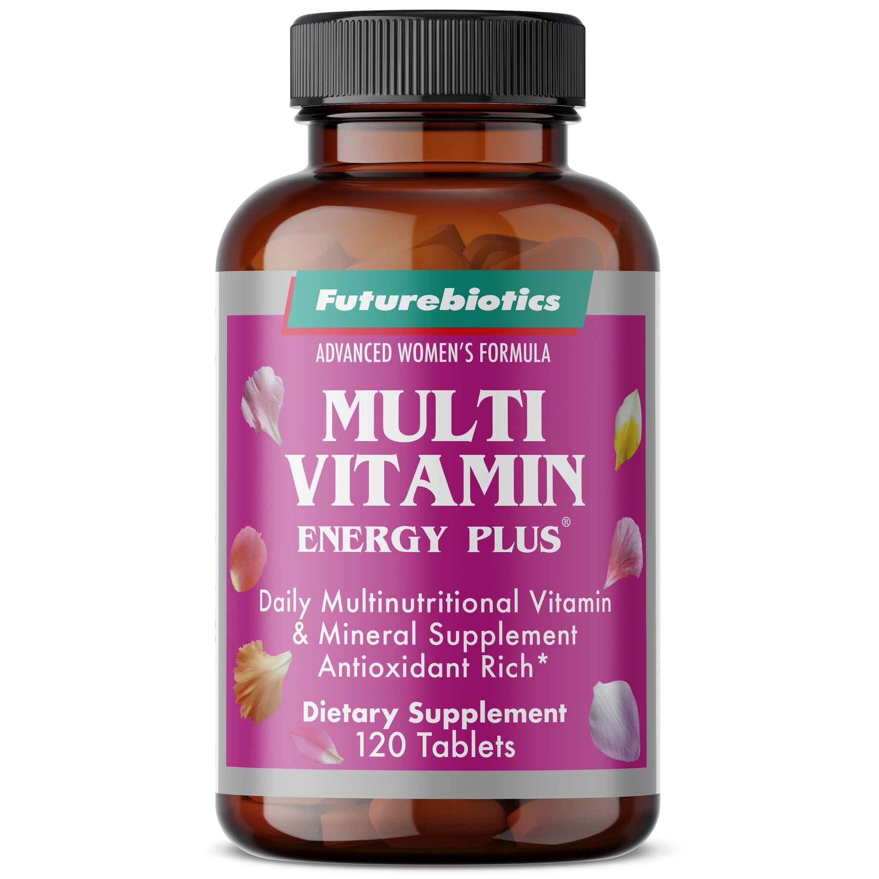 Futurebiotics Multivitamin Energy Plus daily multivitamin is an excellent full-body, everyday supplement for women. This multivitamin is designed with a wide range of necessary and beneficial vitamins and nutrients to support a healthy, active lifestyle*. With over 100% of the recommended daily value for many essential nutrients and ingredients to help your energy levels without the crash, our daily vitamin takes the guesswork out of which supplements are important for your health and well-being. Most vitamins and minerals can be obtained through a well-balanced healthy diet, but our busy lives often prevent that from happening, which makes our multivitamin a simple way for women to receive proper nutrient replenishment.  Simply take two tablets daily with meals or as directed by a healthcare professional.